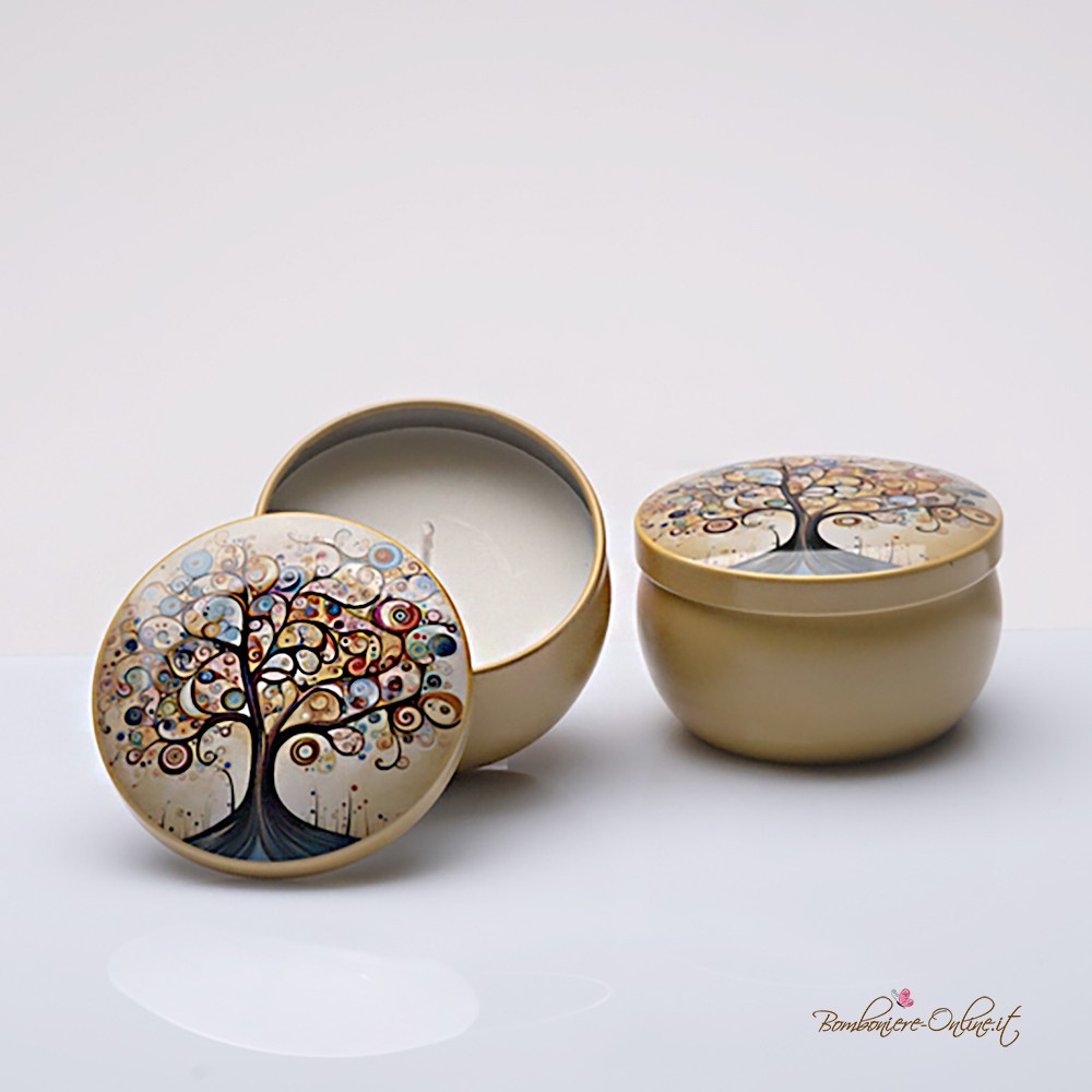 Bomboniera Candela in scatola di latta con coperchio decoro colorato Albero della Vita.