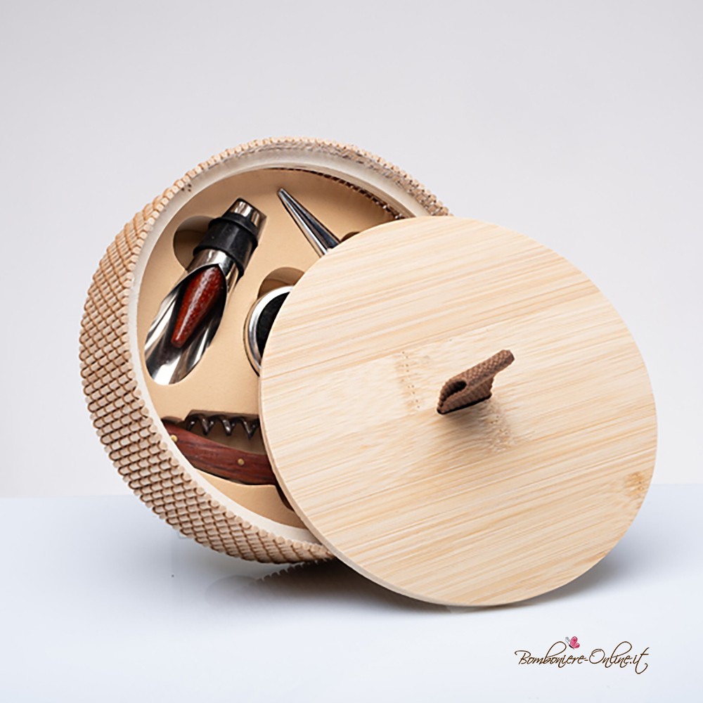 Utile Set quattro pezzi enologia in naturale scatola in bambù.