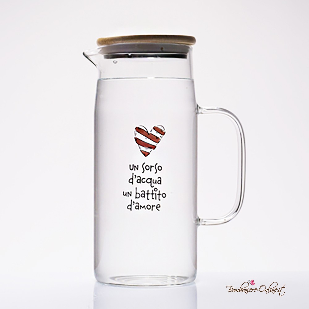 Utile Brocca in vetro borosilicato con tappo frase "Un sorso d'acqua un battito d'amore"
