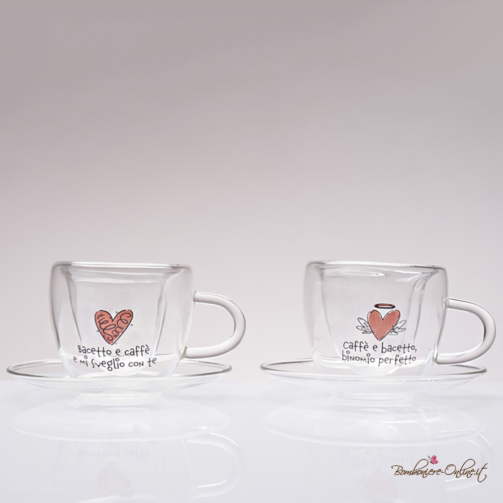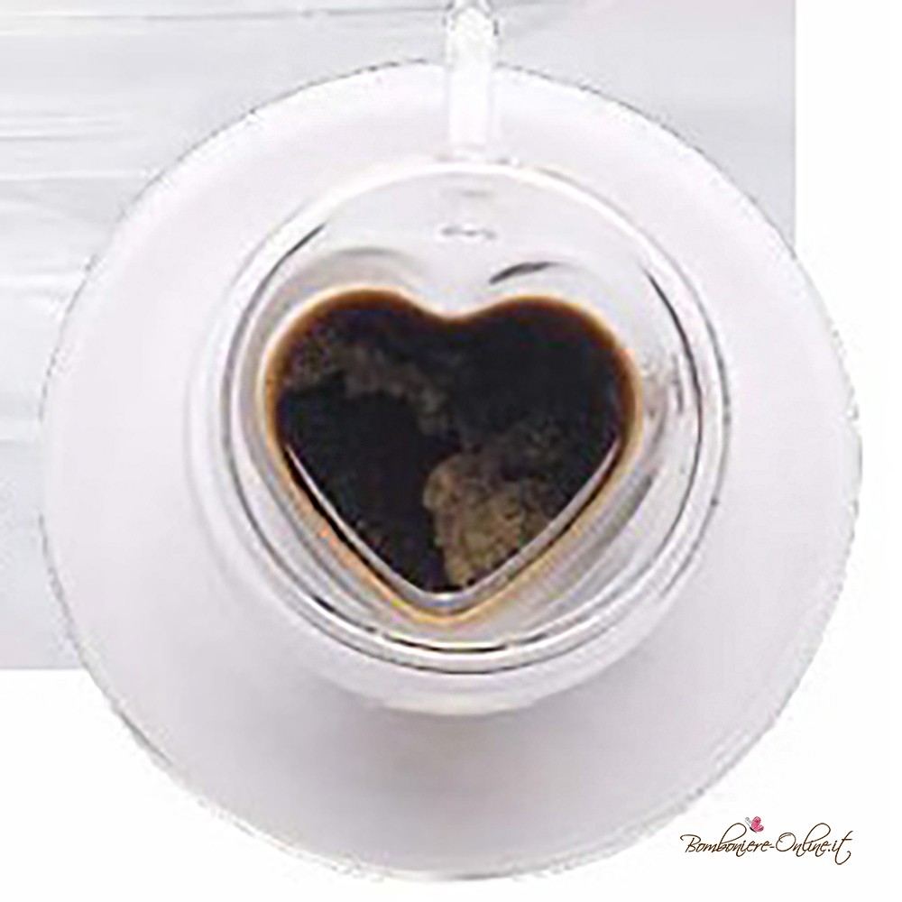 Graziose tazzine in vetro borosilicato con interno a cuore con frase assortita come da immagine.