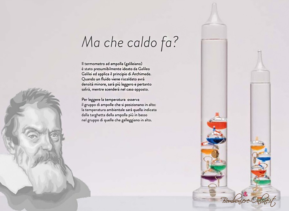Originale bomboniera termometro di Galileo in vetro con interno colorato.