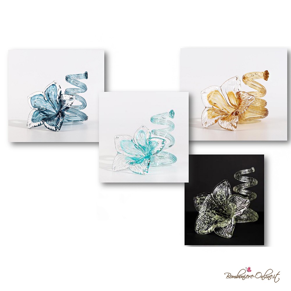 Bomboniera in vetro colorato fiore modellato a mano fluorescente al buio utilizzabile come diffusore, portacandele o vasetto monofiore.