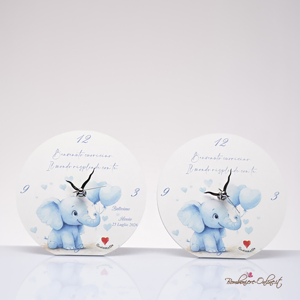 Bomboniera Orologio con tenero elefantino celeste con palloncini a cuore.