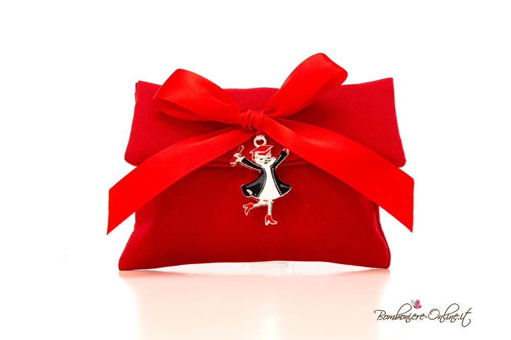 Sacchetto a forma di bustina contenente 5 confetti con ciondolo in metallo ragazza laureata.
