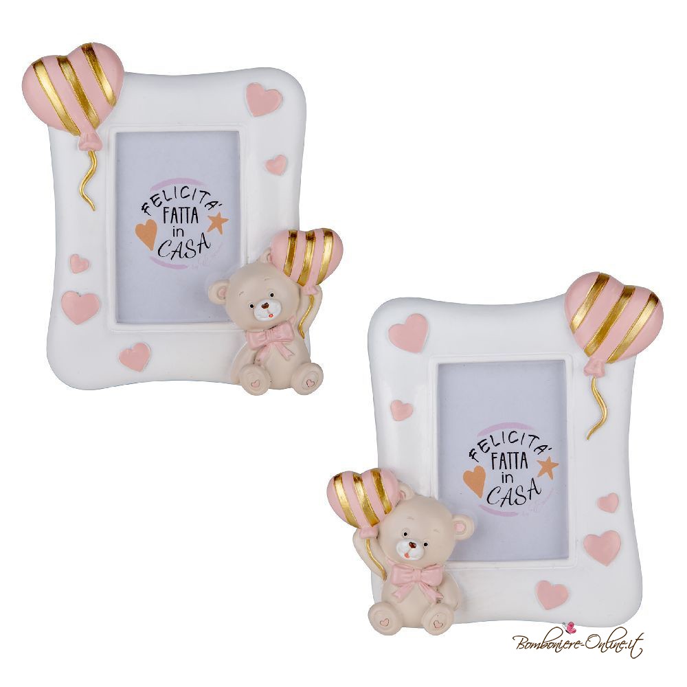 Bomboniera Cornice per Foto con simpatico orsetto rosa con palloncino a cuore fornito nei due soggetti assortiti come da immagine.