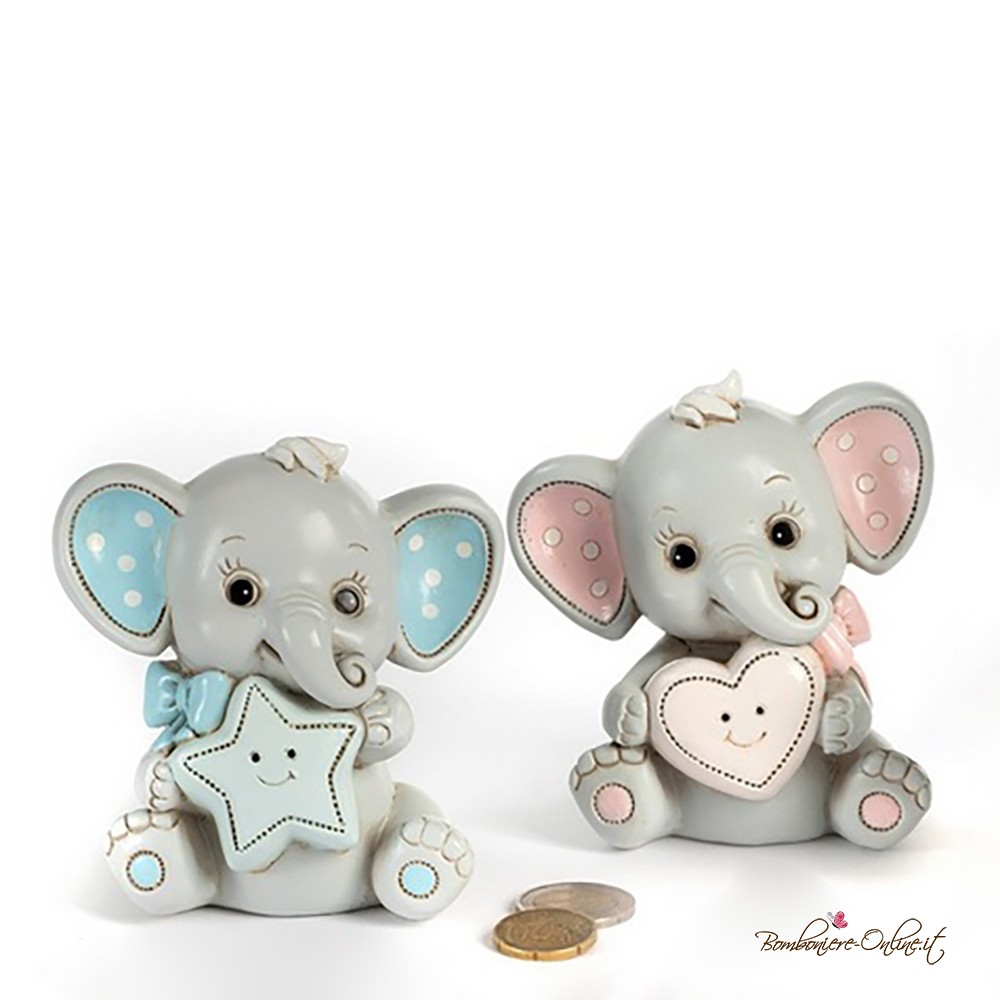 Bomboniera tenero elefantino rosa salvadanaio con cuore tra le mani.