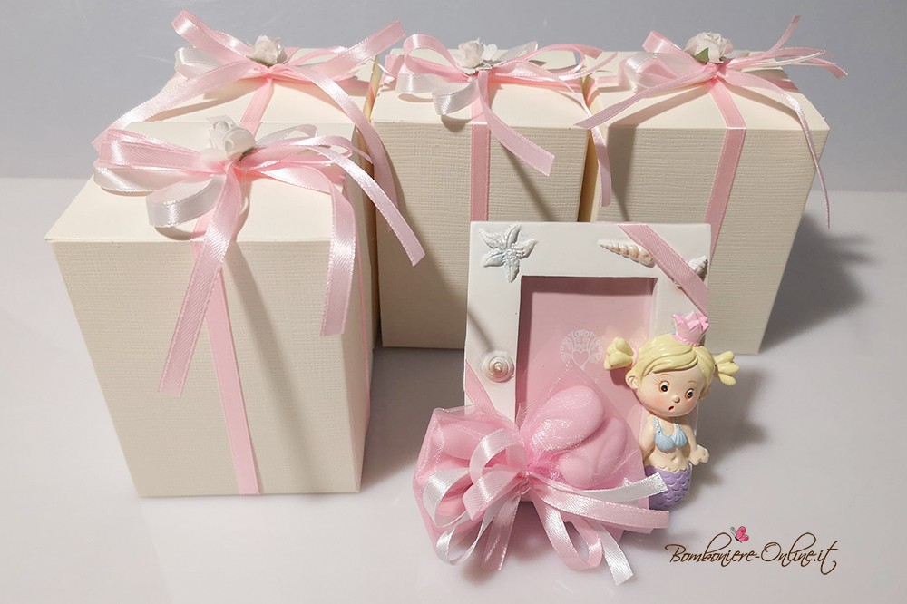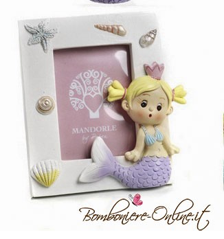 Portafoto con sirenetta raffigurata, sulla cornice sono raffigurate conchiglie e stelle marine.