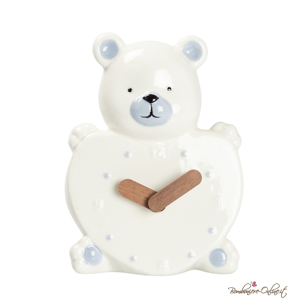 Bomboniera simpatico orsetto in porcellana con dettagli azzurri che tiene tra le braccia un orologio a cuore.