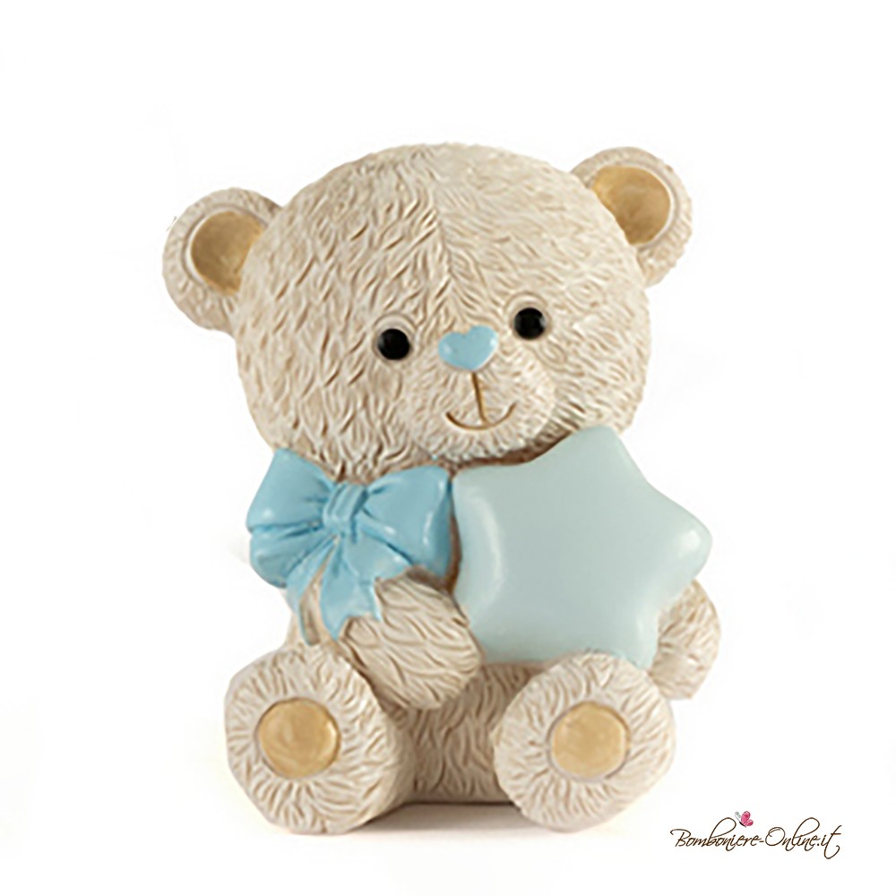 Bomboniera battesimo tenero orsetto azzurro salvadanaio con stella in mano.