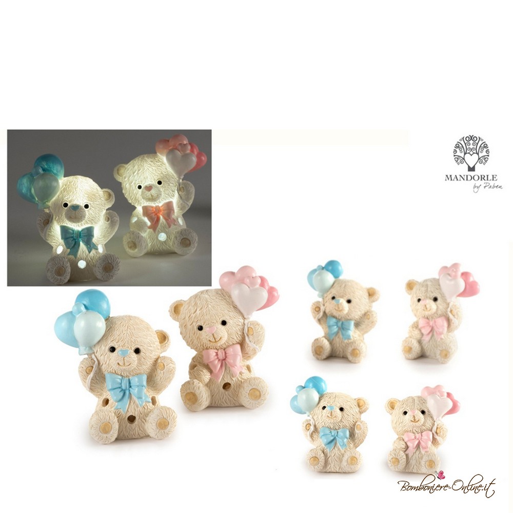 Bomboniera battesimo tenero orsetto azzurro con palloncini colorati.