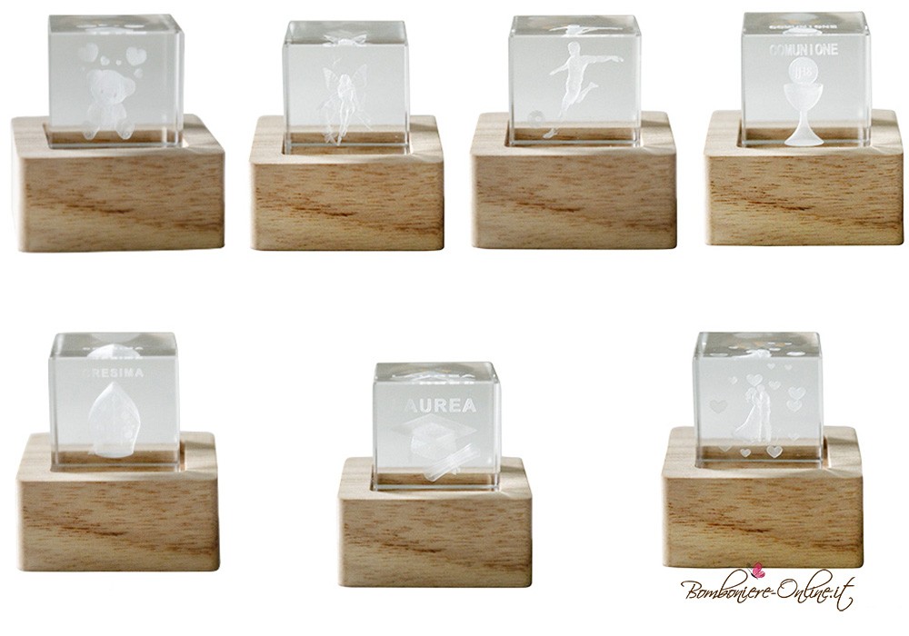 Bomboniera Cubo Lampada crystal su base in legno e luce led integrata con soggetto Orsetto.