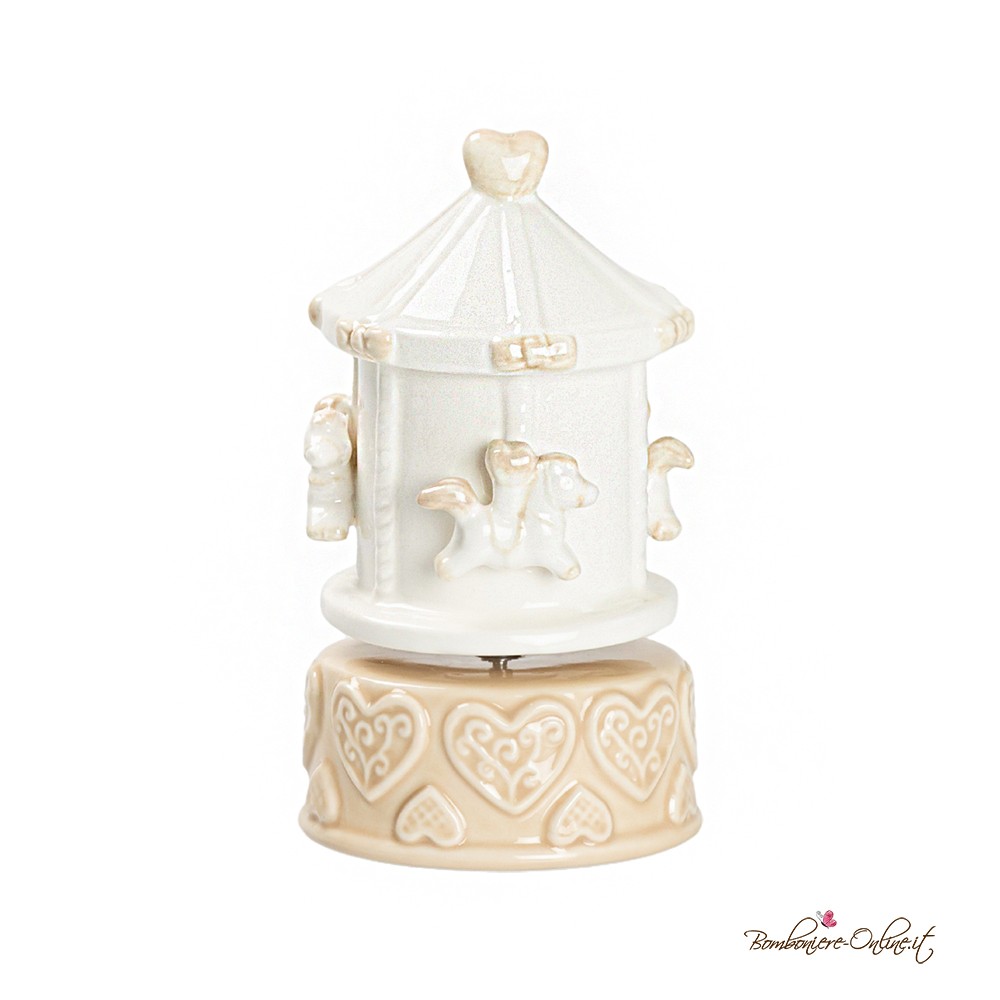 Bomboniera in porcellana delizioso carillon con giostrina di cavalli in color neutro tonalità tortora.