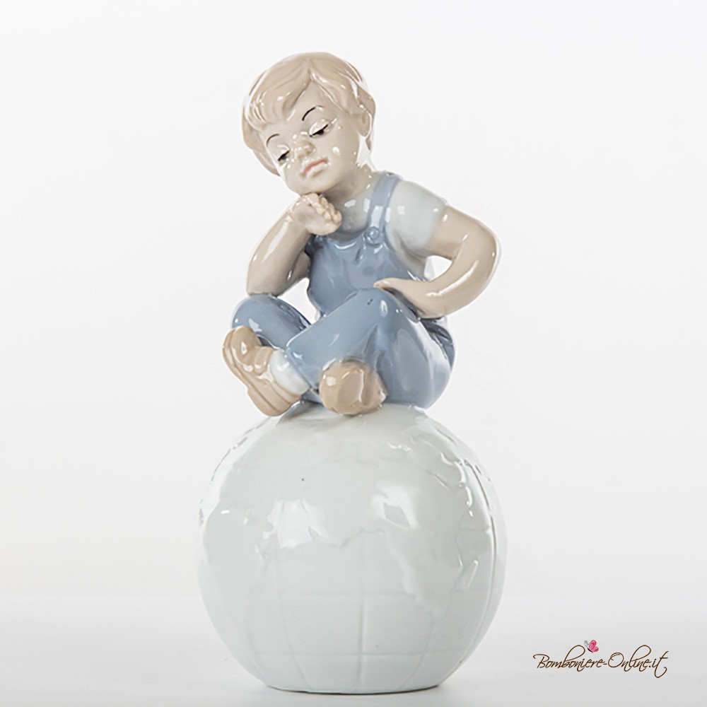 Bimbo seduto su globo mappamondo in porcellana lucida decorata.