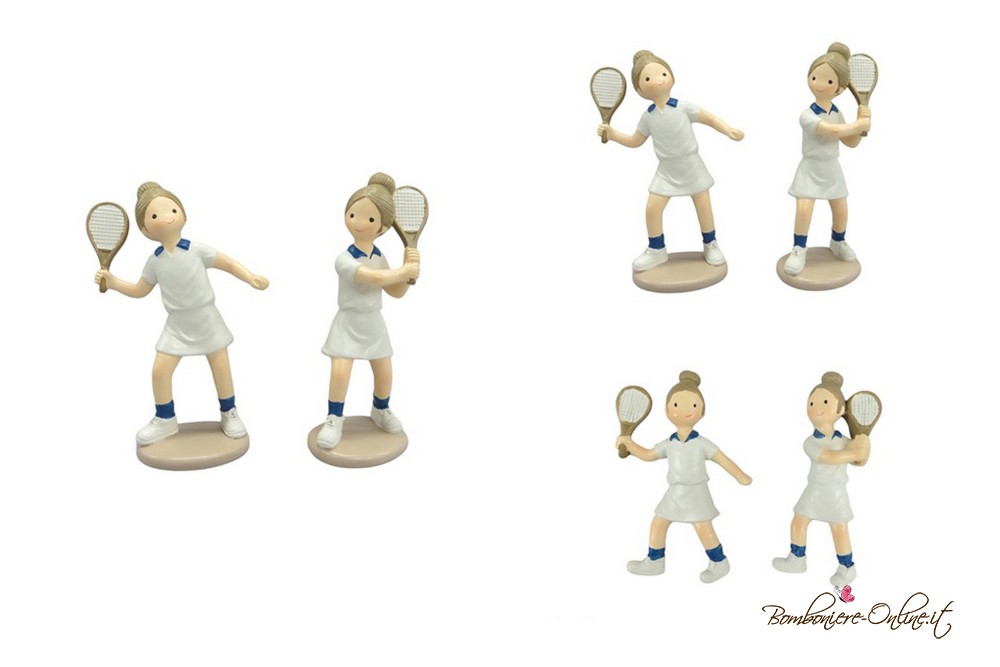Bomboniera ragazza tennista con racchetta in mano e completo bianco.