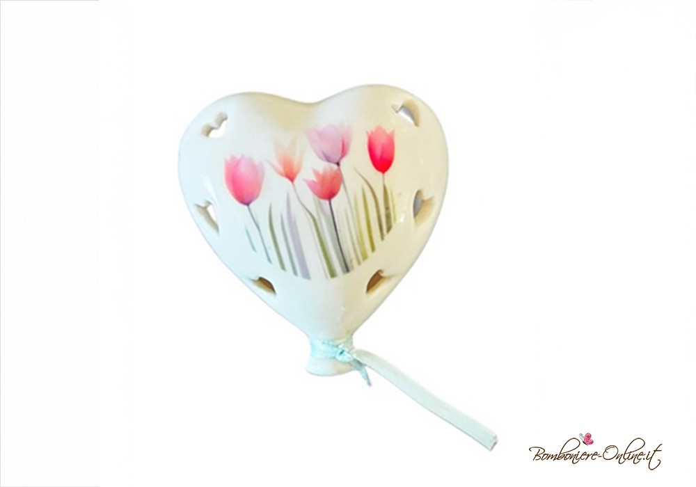 Bomboniera palloncino a forma di cuore con decoro tulipani e luce led interna.