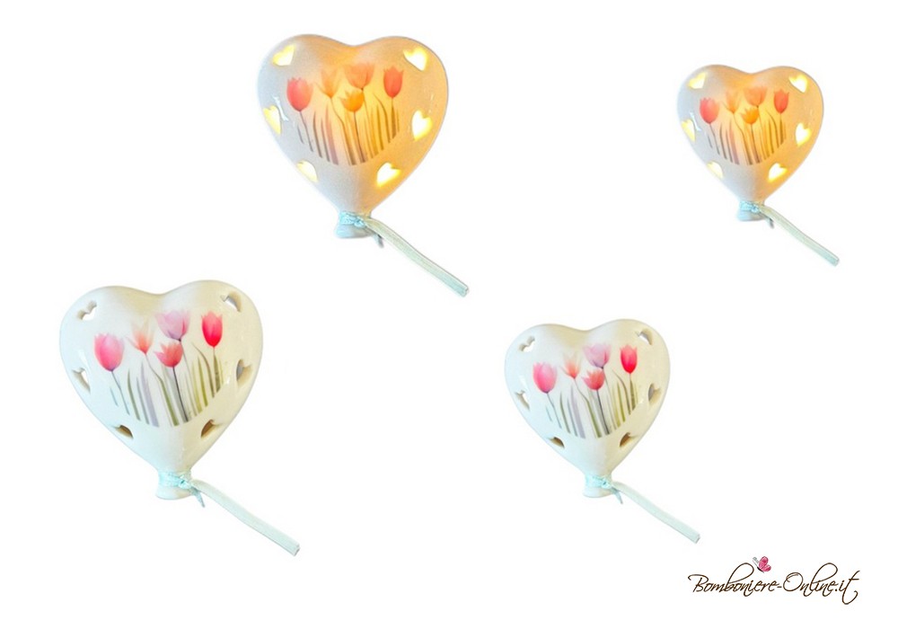 Bomboniera palloncino a forma di cuore con decoro tulipani e luce led interna.