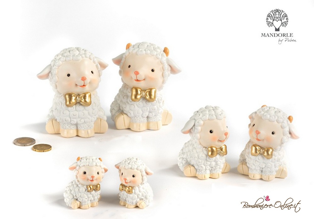 Spiritosa bomboniera con tenero agnellino con fiocco dorato.