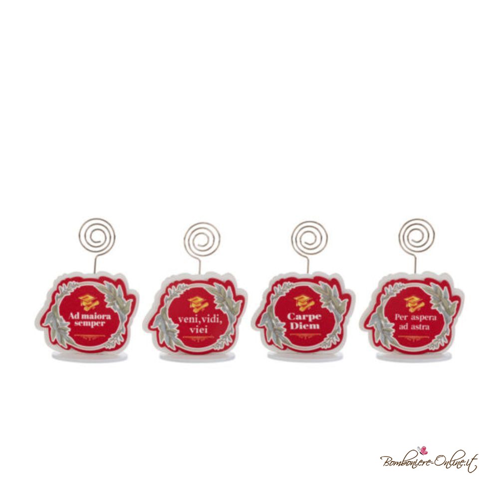 Segnaposto con clip portafoto portamemo in legno con frase latina e con sacchetto rosso contenente 5 confetti.