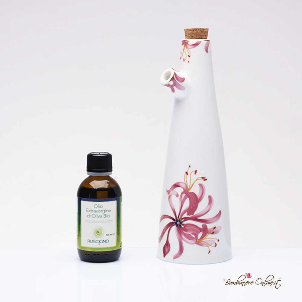 Bomboniera oliera in porcellana con decoro colorato floreale tipico della linea e confezione Olio E.V.O. Frantoio Ruscigno 50 ml.