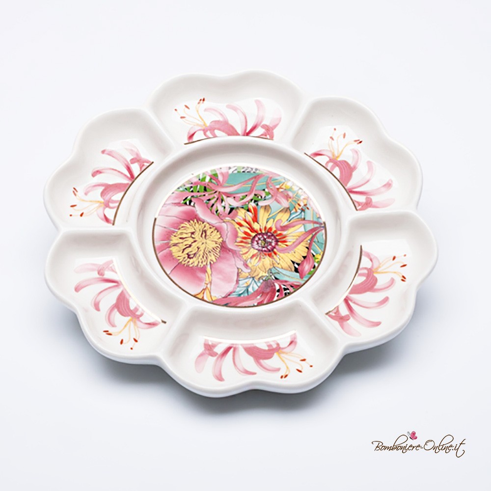 Bomboniera Antipastiera sei posti in porcellana con decoro colorato floreale tipico della linea.