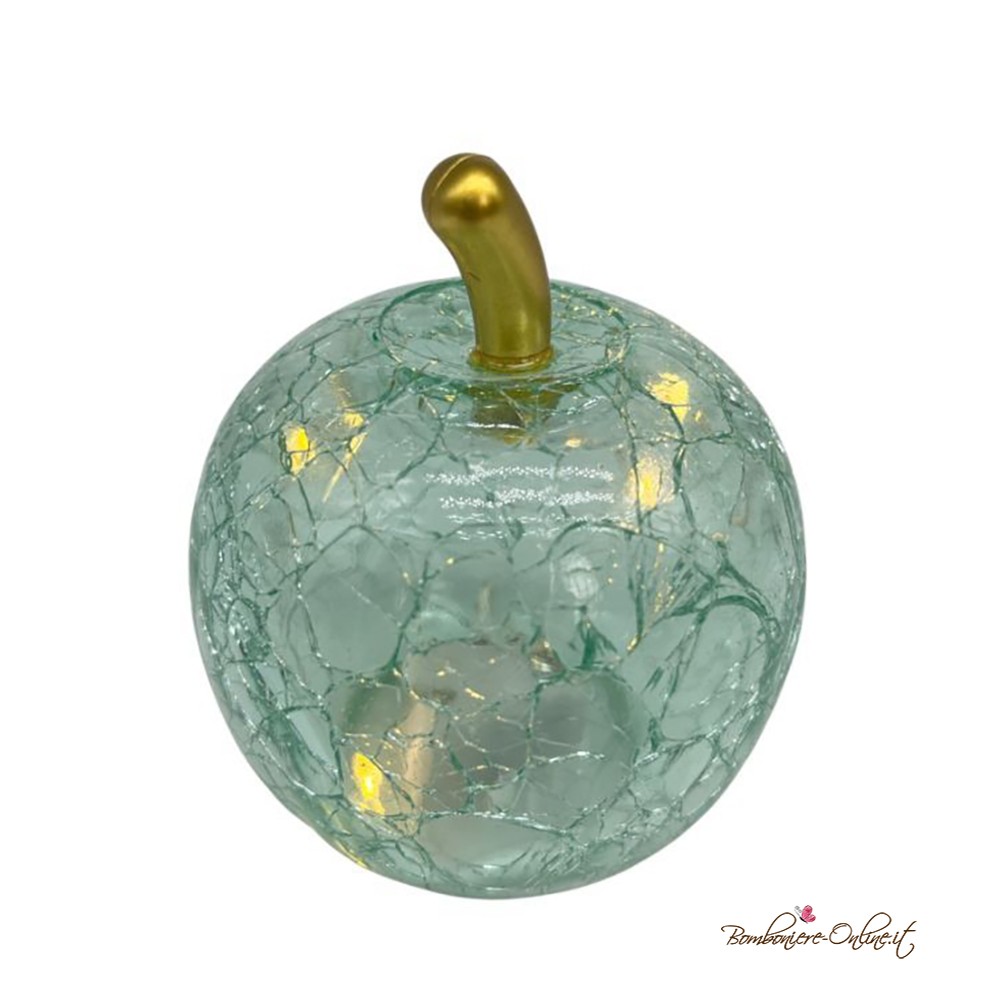 Bomboniera in vetro a forma di mela con picciolo dorato e luce led interna.
