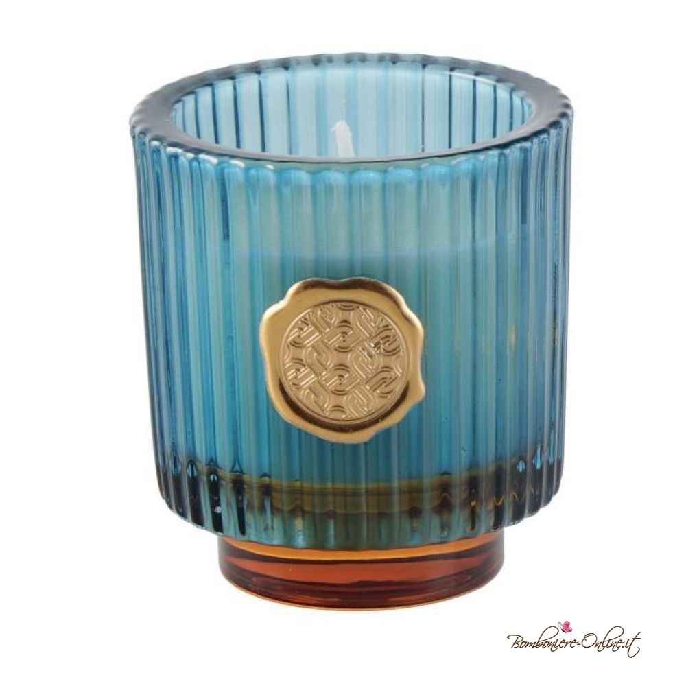 Bomboniera candela inserita in elegante contenitore di vetro azzurro con applicazione sigillo dorato.