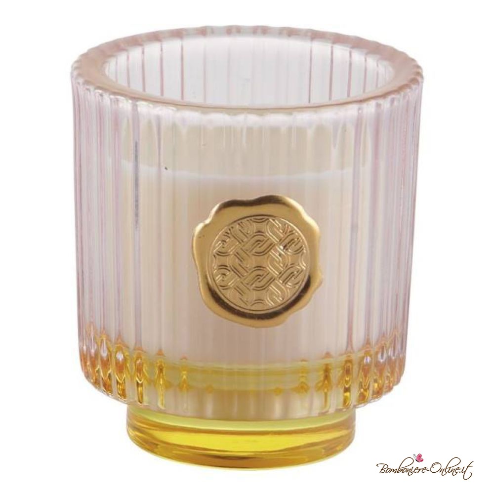 Bomboniera candela inserita in elegante contenitore di vetro rosa con applicazione sigillo dorato.