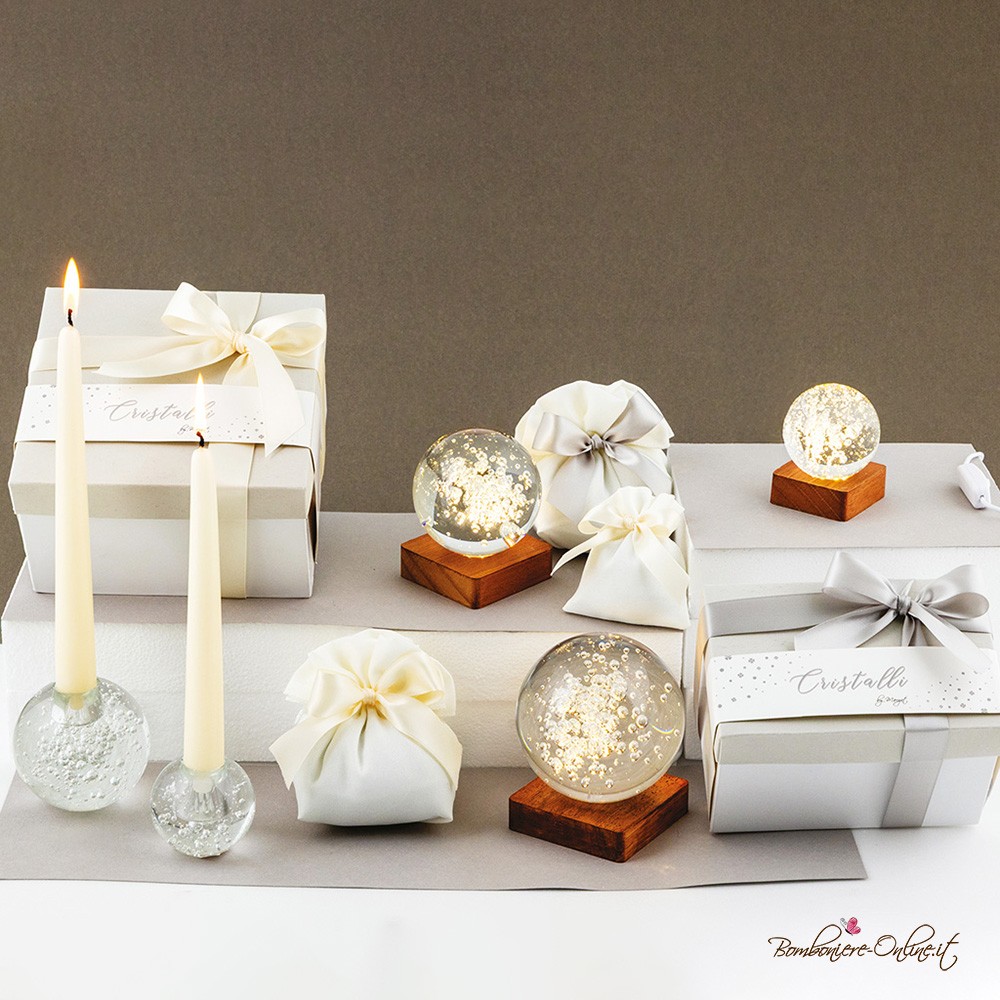 Bomboniera Globo in vetro con eleganti bollicine luce led su base in legno.