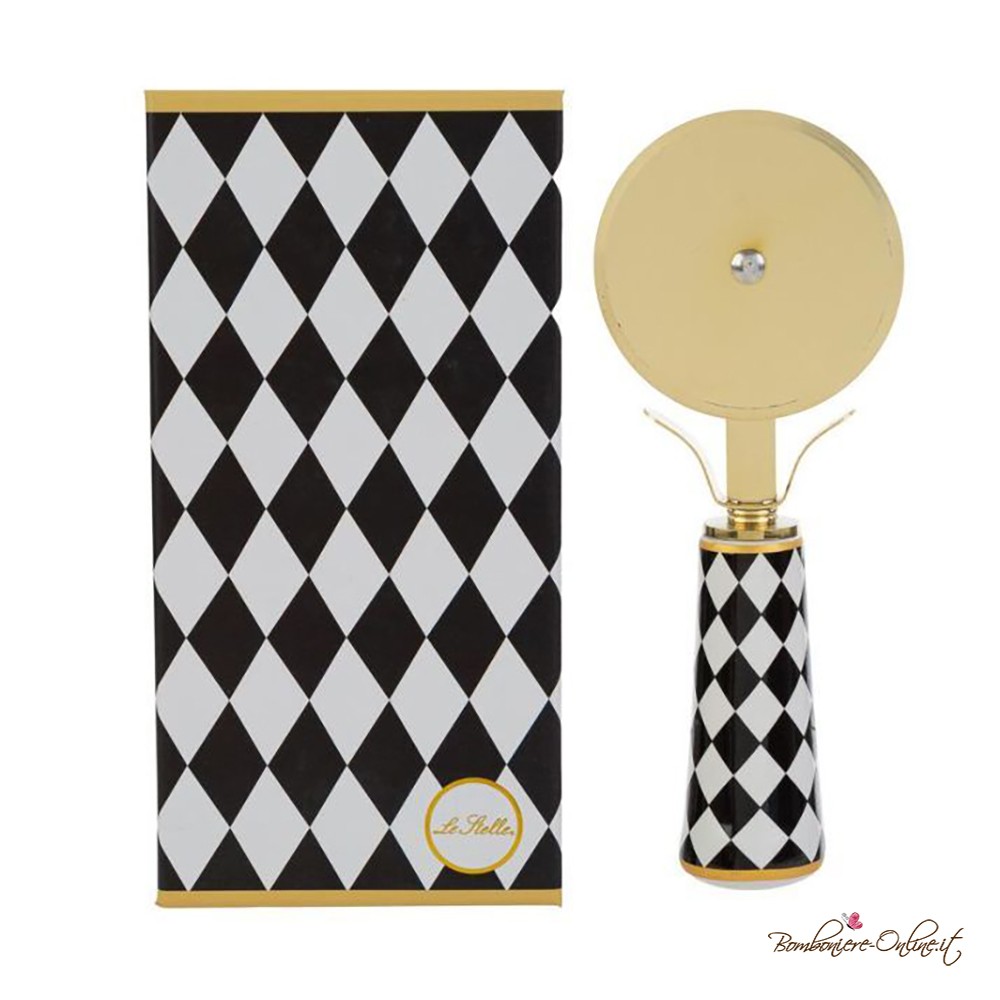 Rotella per pizza in color oro di tendenza e manico con raffinata decorazione a scacchi bianchi e neri.