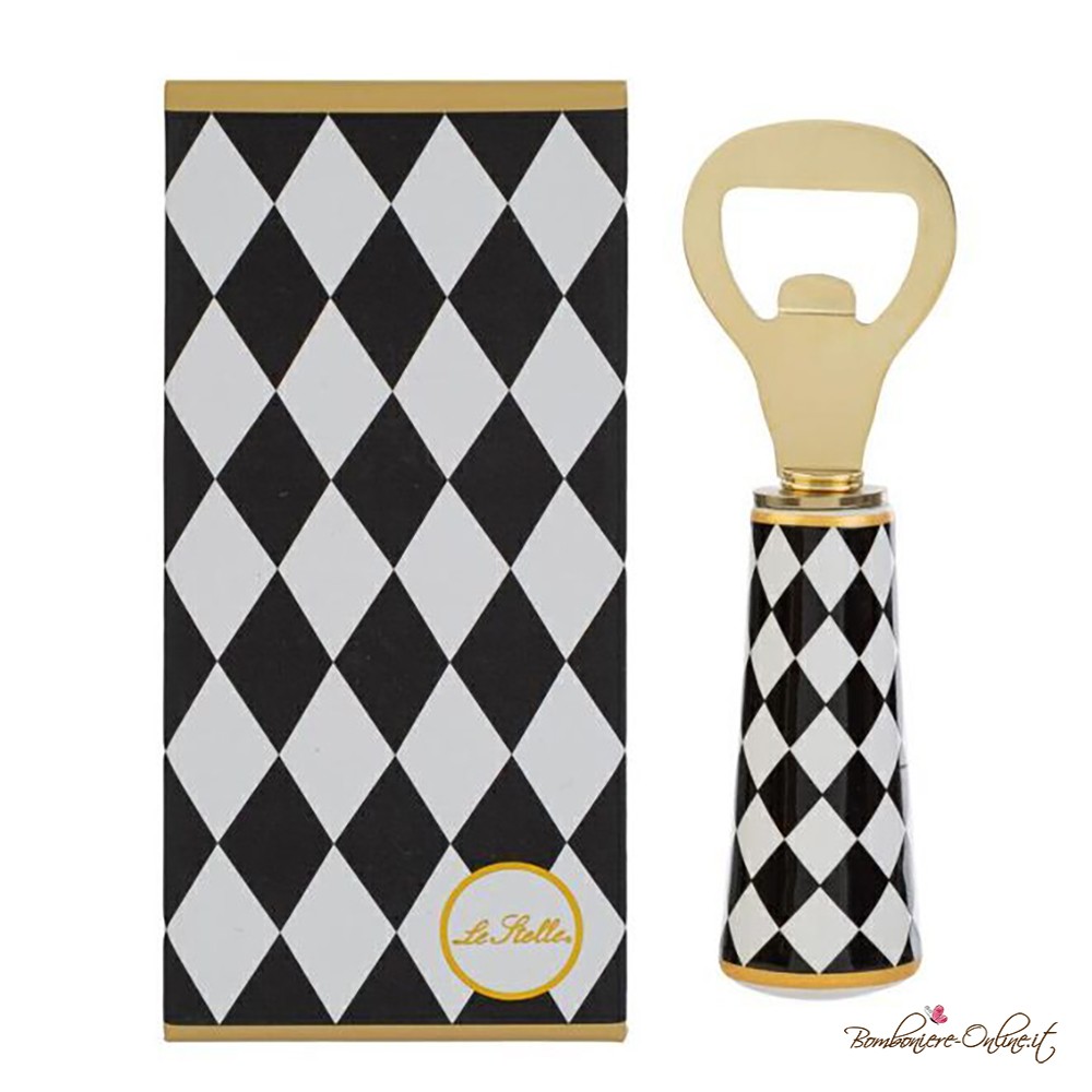 Apribottiglie levatappi in color oro di tendenza e manico con raffinata decorazione a scacchi bianchi e neri.