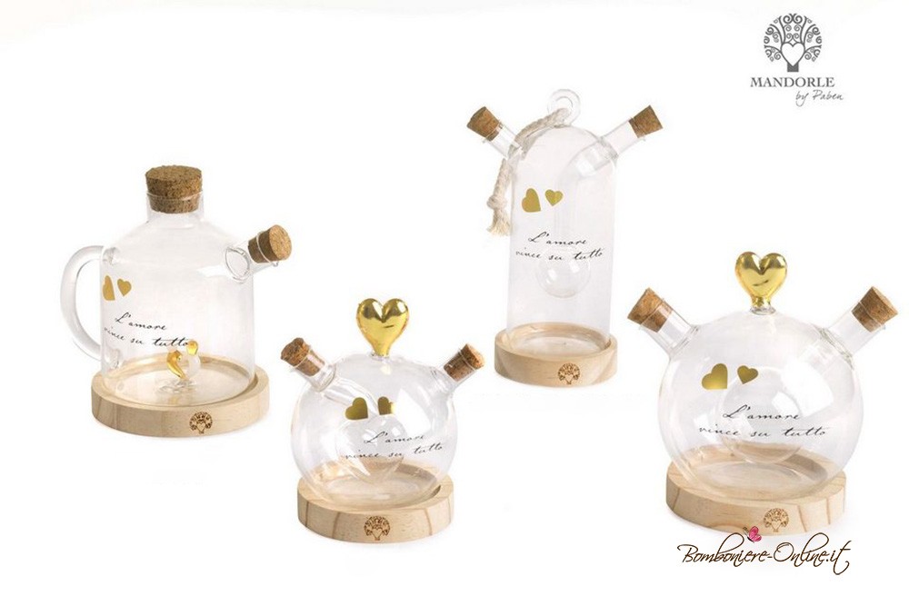 Raffinata bomboniera Oliera in vetro con dettagli oro e romantica frase d'amore.