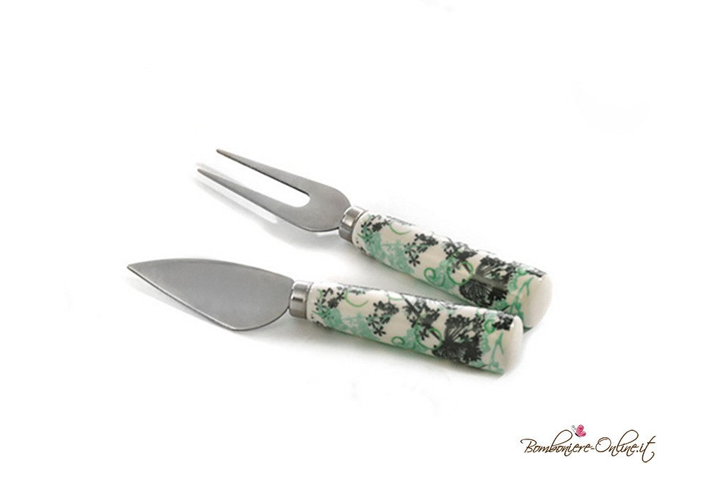 Bomboniera coltello e forchettina per formaggi in metallo con manico colorato decoro moderno floreale.