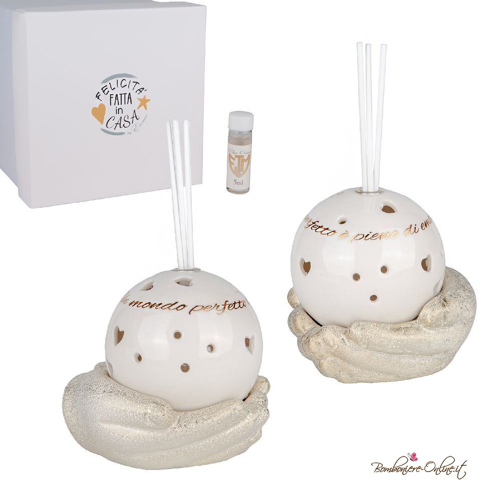 Bomboniera profumatore sfera di colore bianco con scritta oro tenuta nelle mani.