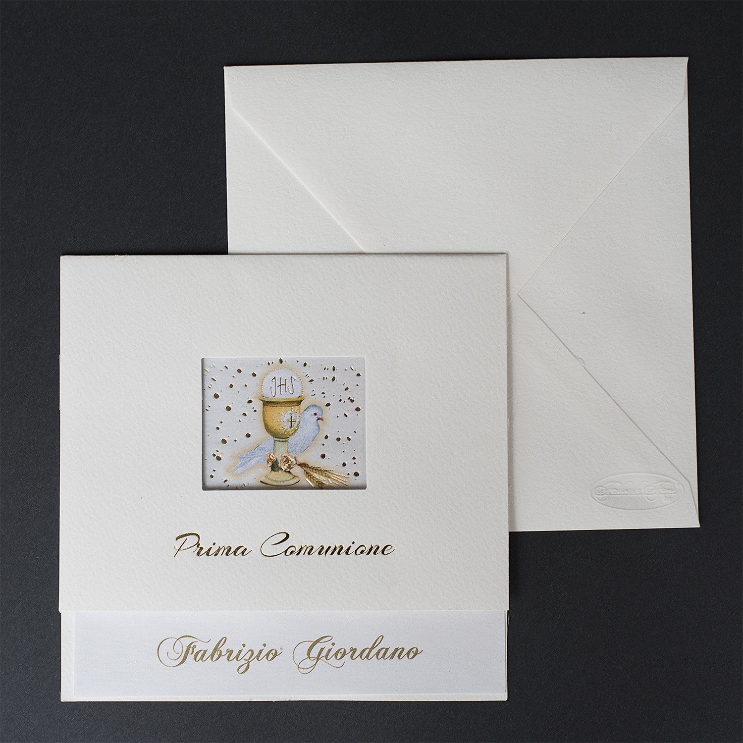 Invito Prima Comunione dalla forma quadrata, in cartoncino bianco ruvido con finestra con calice. Busta invito inclusa.