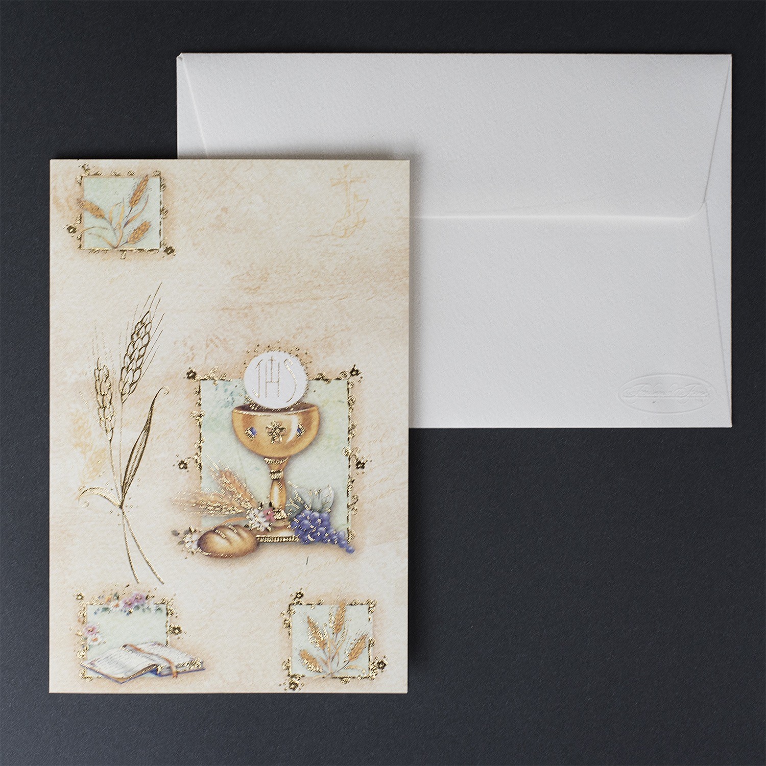 Invito Prima Comunione dalla forma rettangolare con pisside ed altri elementi dorati. Il testo viene stampato all'interno, che è di color bianco. Busta invito inclusa.