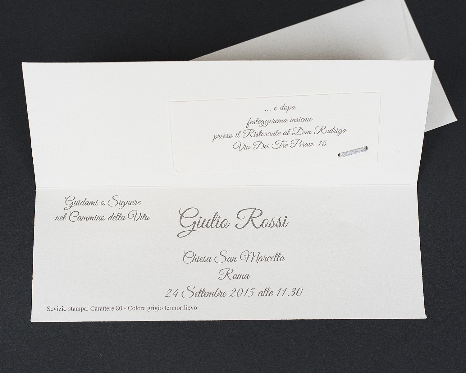 Invito Prima Comunione orizontale eseguita in cartoncino liscio con decorazione perlato dal motivo floreale, con applicazione esterna di un talloncino Prima Comunione eseguita con taglio laser fissato al biglietto con un elegante nastro in raso grigio. Il nastro lega anche il talloncino interno dell'invito al ristorante. Busta invito inclusa.