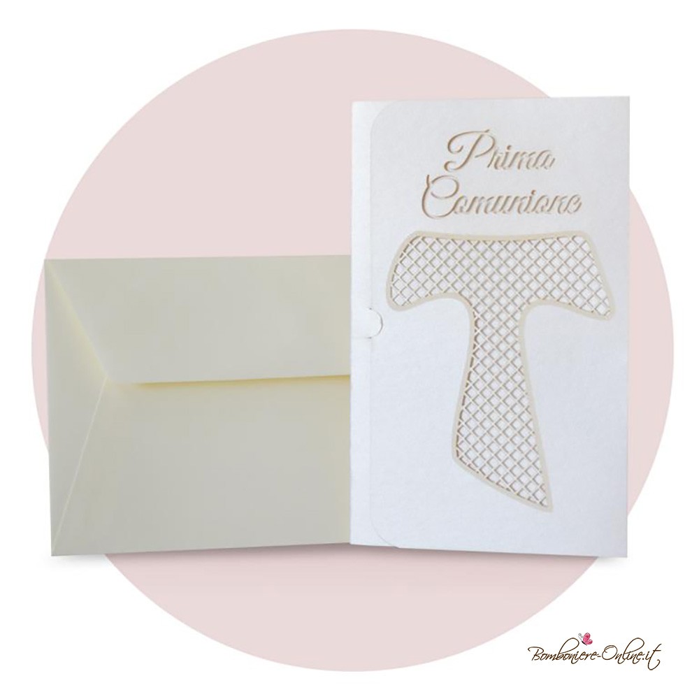 Invito Prima Comunione di forma rettangolare chiuso in tre parti, realizzato su carta perlata ed un tao tagliato a laser sul fronte.