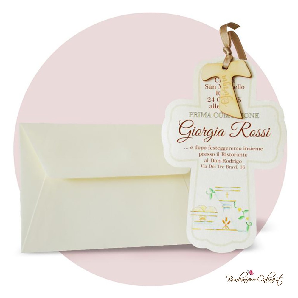 Invito Prima Comunione sagomato a forma di croce con Tao personalizzato in legno.