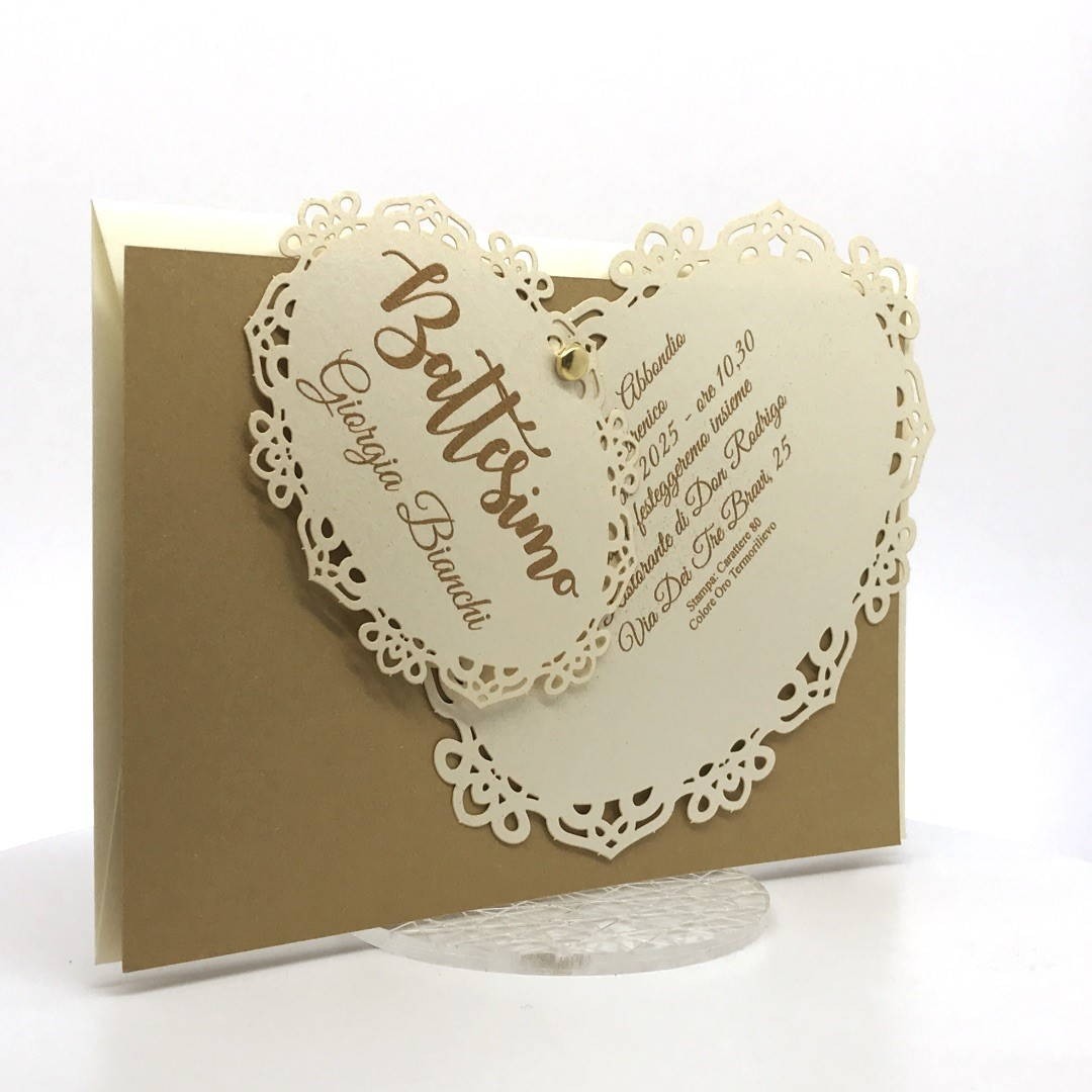 Invito Battesimo rettangolare in carta marrone con applicazione di due medaglioni per l'iscrizione del testo con raffinato bordo taglio laser in carta perlata avorio.