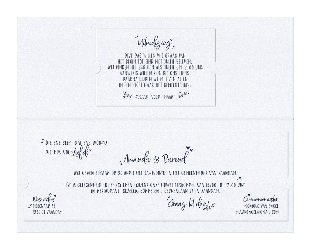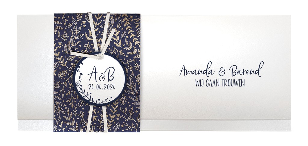 Partecipazione di nozze orizzontale di carta madreperlata con elegante fascia e cartellino per le iniziali e data. Contiene il biglietto di partecipazione e separatamente il biglietto invito.