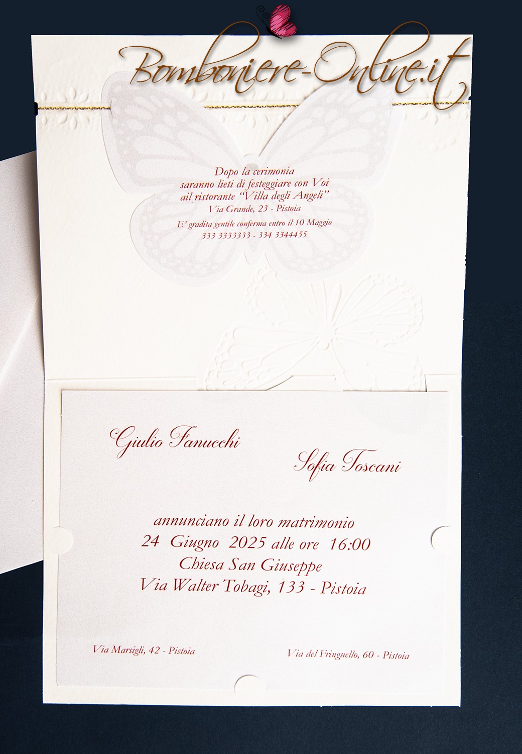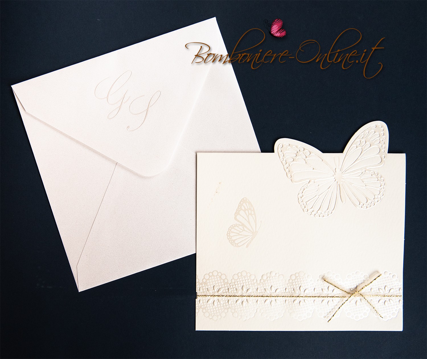 Partecipazione nozze color avorio con delicata grafica classica a tema farfalle con nastrino con filo dorato ad impreziosire il tutto.