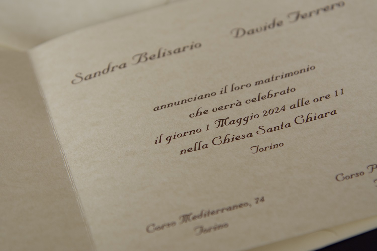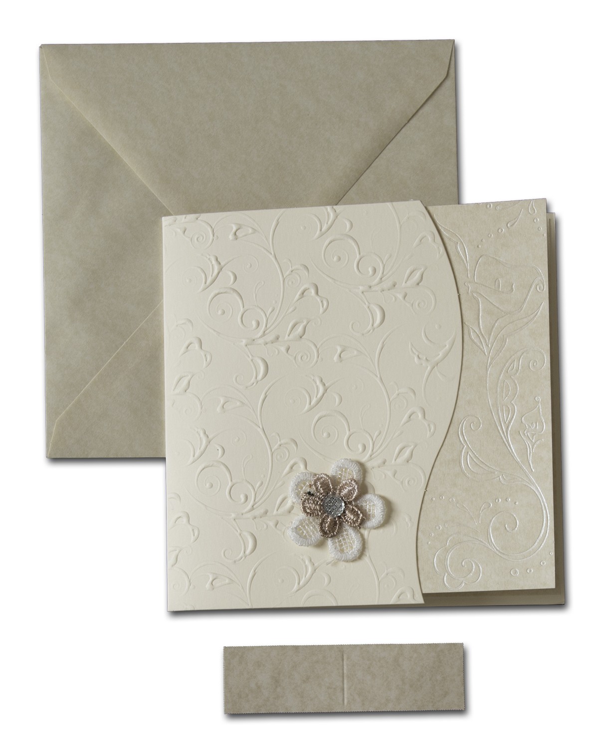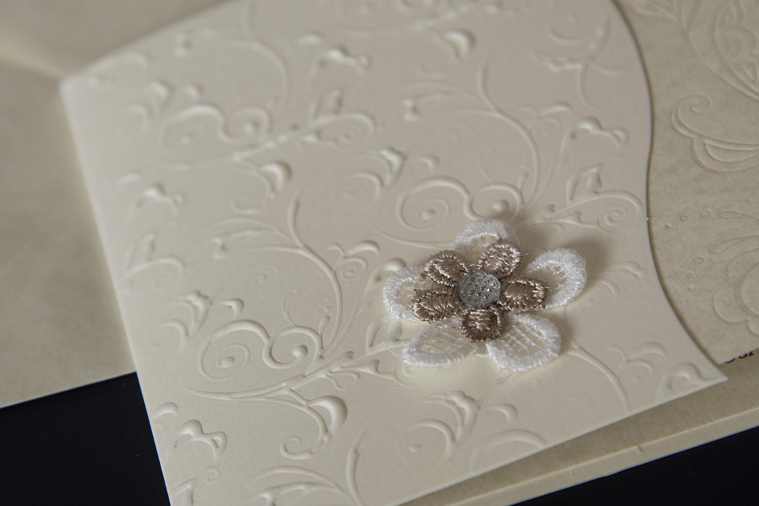 Partecipazione in cartonicino avorio con decori in rilievo e fiori in pizzo applicati.