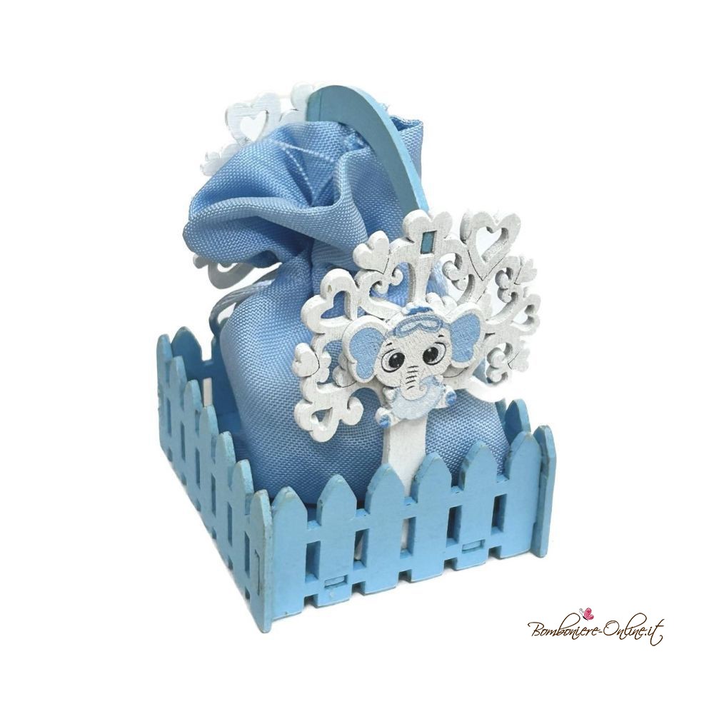 Bomboniera cestino in legno con sacchetto portaconfetti azzurro con albero e elefante.